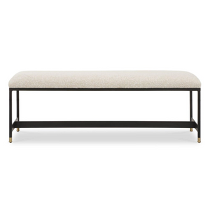 This bench features a sleek matte black iron frame and is paired with a plush upholstered seat in a casual off-white polyester blend with wool-like texture, accented with petite brushed brass feet caps.