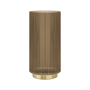 Enhance the elegance of your living room or dining room with this ribbed textured glass cylinder vase featuring a gold metal base. The brown color glass adds a modern sophistication, while the ribbed texture creates a visually captivating aesthetic. Perfect for showcasing bouquets, this vase can also serve as a stunning centerpiece.