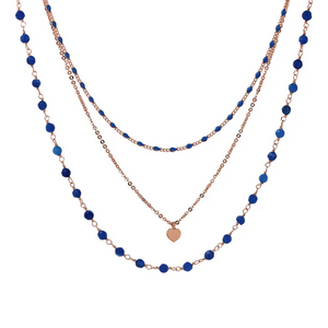 This graduated multi-strand necklace is made of Golden Rosé alloy and composed of three strands: the longest is a rosary chain with faceted natural stones, in the middle is a flat rolo chain with a heart pendant and the shortest strand is a thin lump chain with enamelled elements.