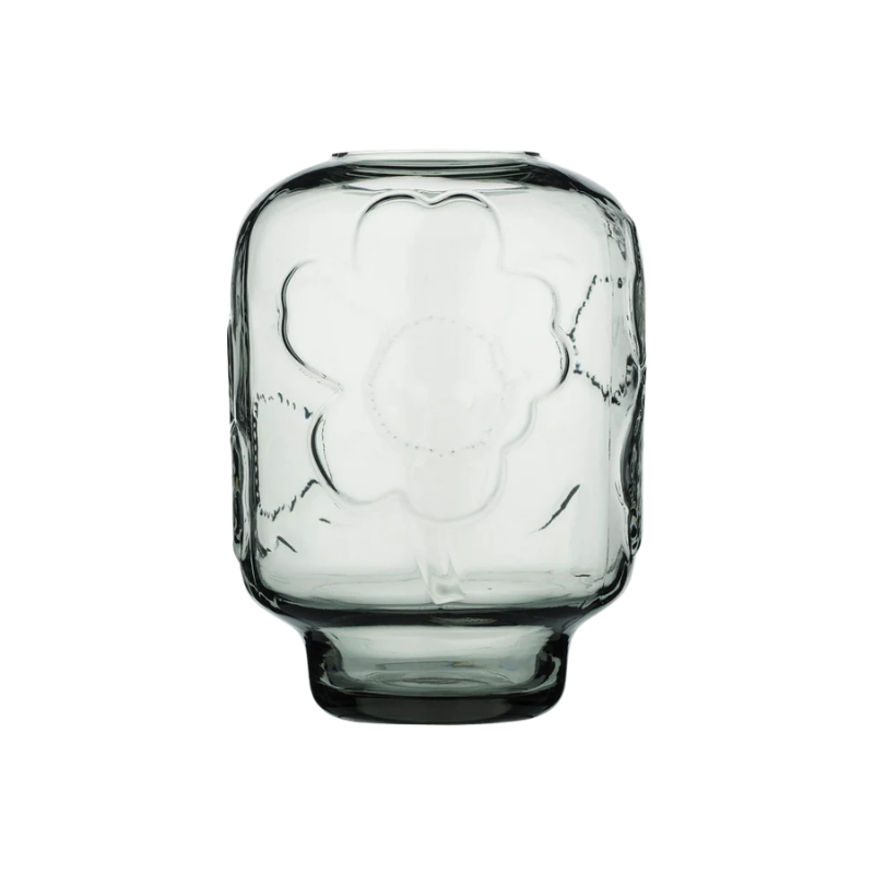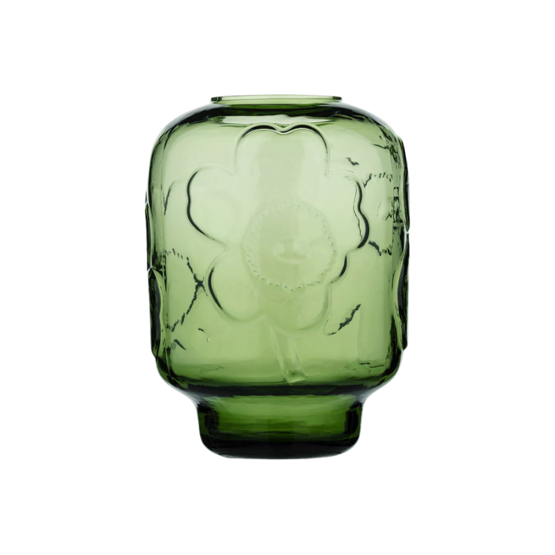 This glass vase features the embossed Unikko pattern. We recommend washing the vase by hand. Marimekko’s glassware items are mouth blown into a mold. Being made by hand, they may contain small signs of craftsmanship. Slight variation between products is natural.
