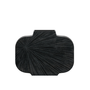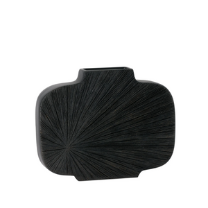 Sculptural and striking, this slim resin vase features a radiating carved pattern and a rich black patina for a bold modern look. Its reversible design lets you switch up the style. One side flows upward, the other downward, offering two distinct display options in one piece. Perfect on its own or paired with stems for a dramatic accent.