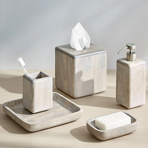 Create a calming feel in your bathroom with these bath accessories. Made from mango wood and whitewashed for a natural, weathered appearance.