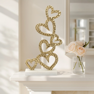 This sculpture features stacked aluminum gold hearts on a polished marble base, offering a stylish nod to romance. Its clean lines and elegant materials create a modern yet meaningful accent. Ideal for adding subtle warmth to shelves, consoles, or tabletops.