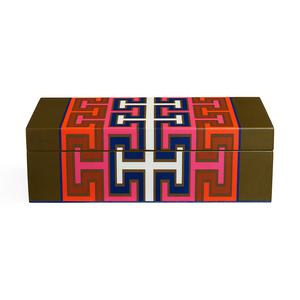 Featuring a bold pattern in vivid hot tones with a white and navy accent down the middle and a hand-finished high-gloss shine. A chic and tidying addition to your shelf, mantel, or tablescape. Keep your possessions handy but hidden. Available in three sizes for stashing, stacking, or making a stand-alone statement.