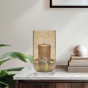 Elevate your space with this striking amber-tinted hurricane glass featuring a captivating waterfall texture that plays beautifully with light. Set on a brushed metallic gold base, this pillar candle holder adds a luxurious modern touch to any room.