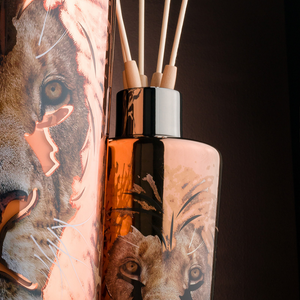 Luxury reed diffuser made of ceramic, with the design of the animal it represents. High absorption rattan rods, presented in a designer case with a hot stamping finish. Africa lion, is a woody, spicy perfume with notes of peony, rosemary, palo santo, papyrus, sandalwood and benzoin.