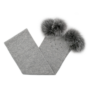 Knit scarf with crystals, diamond waeve & fox pompoms.