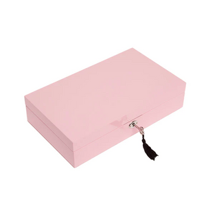 This jewelry box is a luxe, handcrafted jewelry organizer. It is finished with a high-gloss lacquer, and its interior is lined with soft, ultra-suede. It also features a hinged lid with a vanity mirror inside, and a pretty little tasseled key so you can lock it.
