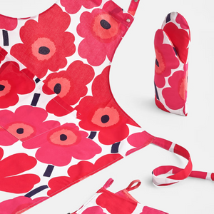 This cotton apron features the classic Pieni Unikko pattern in red. One front pocket, an adjustable neck strap and bands at the waist that can be tied together at the back.