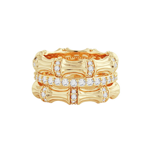 Crafted in 18k gold dipped bronze and detailed with hand-set pavé crystals, the Bamboo Stack Ring offers an elegant sparkle in a memorable silhouette, effortlessly adding a hint of glamour to your everyday wardrobe. Different sizes available.