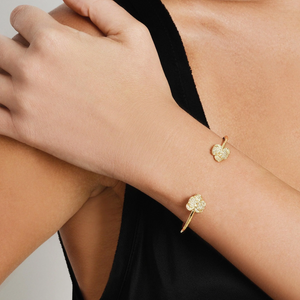 The Orchid Pavé Bangle, by Anabel Aram, features artfully sculpted and crystal encrusted orchids mounted on a malleable hand hammered bracelet which is easy to bend for a perfect fit. Crafted from 18k gold dipped brass. This everyday piece looks great when worn alone or stacked.