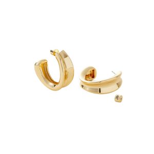 A large pair of high-shine hoops featuring sculptural curves and a rounded tail, as seen on Selena Gomez. Despite their bold body, they are lightweight, thanks to a hollowed out design. Finished in high-polish gold.