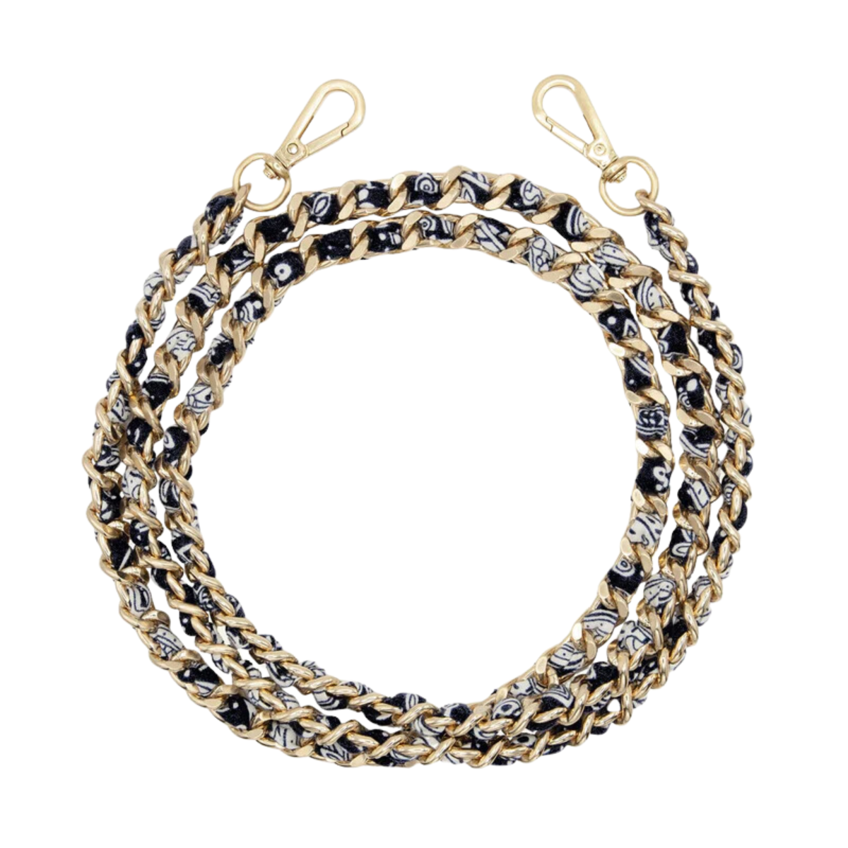 This strap is braided with a golden chain and a bandana inside. Perfect for adding a touch of colour to your summer outfits ! With its two rotating hooks, it can easily be attached to any Louvini phone cases. It can be worn crossbody or as a necklace.