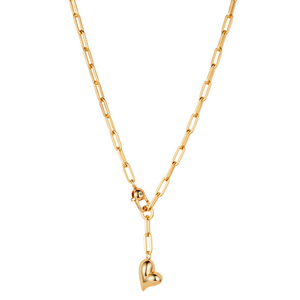 A joyful, inflated heart is suspended from a paperclip link chain necklace. Finished in high-polish gold.