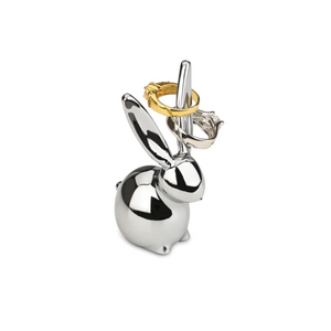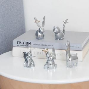 A whimsical yet modern animal ring holder that allows space to keep multiple rings safe and accessible. Each ring holder is constructed of zinc metal and has a shiny chrome-plated finish.