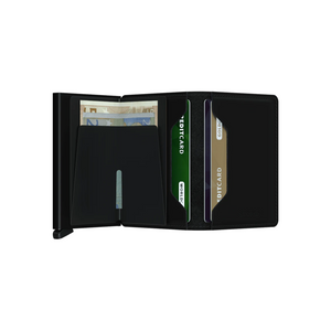 Its slim profile makes the Slimwallet fit perfectly into every pocket. The open exterior is cut extra wide to hold cards, banknotes and receipts. The Cardprotector mechanism allows you to slide out cards with one simple motion, while the aluminium protects your cards from bending, breaking and unwanted wireless communication.