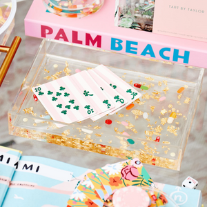 The difference is clear. These acrylic trays offer a unique and transparent way to serve up some style! Sassy and a little bit extra, this tray features various over the counter medications, hand-filled sprinkle/glitter capsules and gold flake. All pills are covered in a thick layer of resin, making the tray totally waterproof and easy to clean.