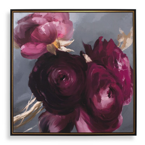 Lush, ranunculus blooms take center stage in this canvas. The velvety petals in deep plum with hints of pink rest against a soft, smoky gray backdrop while accents of pale gold and green add depth and dimension to the floral composition. A refined double gallery frame, featuring a striking black and gold finish, encases the artwork. Artwork by Danhui Nai.