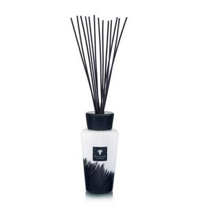 The Feathers diffuser is presented in a sleek opaque white glass bottle adorned with delicate black details that form a feather-like effect. Its perfume is woody with notes of delicate black rose, an ode to the male-female duality.