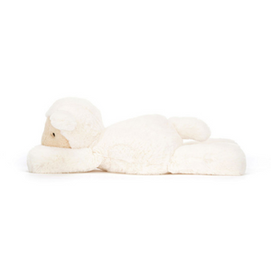 Some lambs frolic. Smudge Lamb flops. Bounding through fields isn’t quite her style… In truth, she’d much rather sink into the nearest blanket pile. A devoted nap enthusiast with a sumptuously soft coat, she’s always keen for a sleepover. In fact, she’s living proof that sometimes, doing absolutely nothing is a skill in itself.
