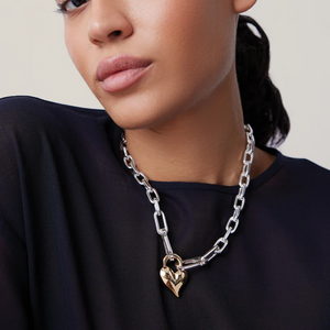 A removable gold heart is hooked onto crisp, faceted silver links, creating a modern two-tone necklace. The chain can be split in half and used as a bag charm or keychain. Finished in high-polish gold and silver.