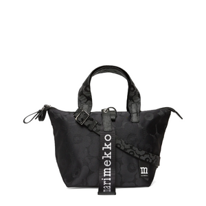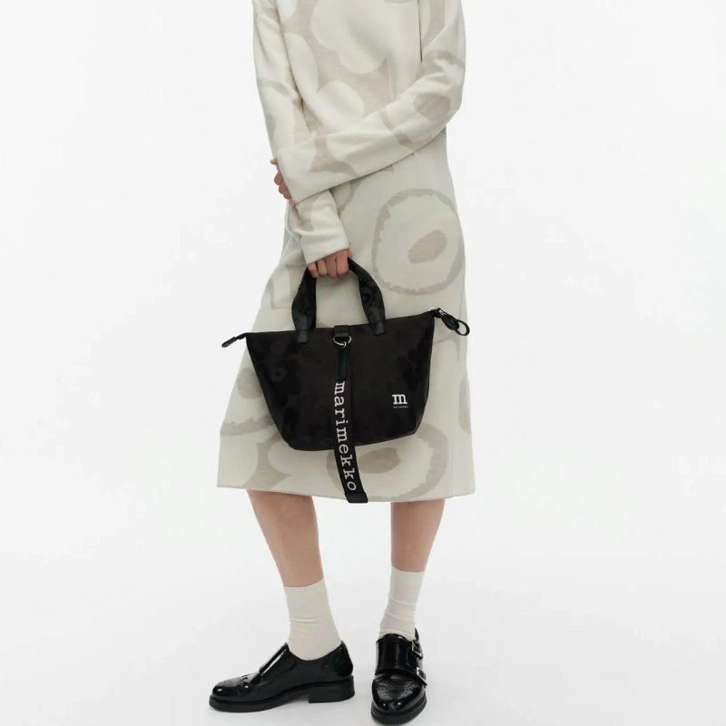 The Tote S shoulder bag features the jacquard knit Unikko pattern. The bag has a zipper closure, a handle, and an adjustable shoulder strap. The inside is lined, and it has one slip-in pocket. The front features the Marimekko logo label and the Marimekko keystrap that is attached with a D-ring.
