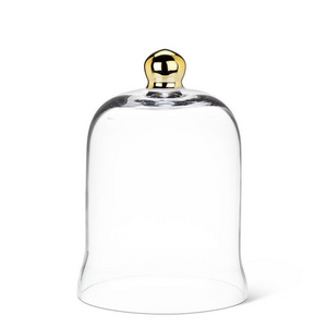 This Medium Bell Shaped Cloche with a Gold Knob allows for a beautiful display of items underneath, while the gold knob provides a refined accent. Perfect for showcasing desserts, candles, or decorative objects in style.