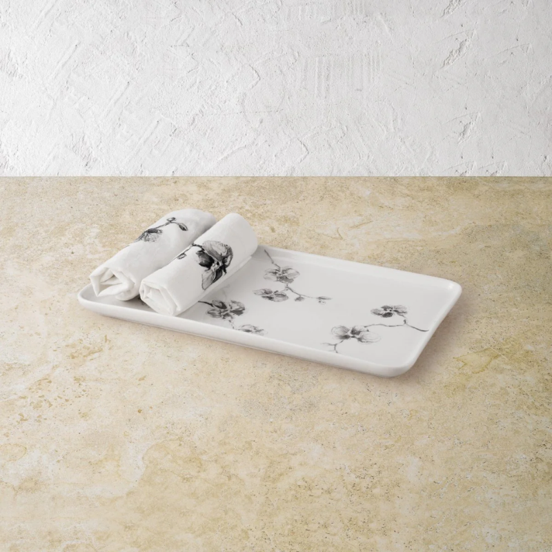 The Black Orchid Vanity Tray brings refined elegance to the bath, transforming function into artistry. Handcrafted in luminous porcelain, its sleek form captures the mystery and allure of the black orchid, sensual, graceful, and timeless. Perfect for displaying essentials, it elevates everyday rituals with sophistication.