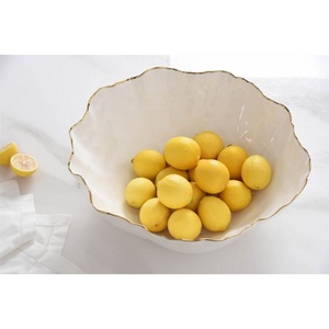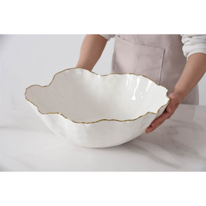 Make a statement of timeless elegance with this stunning piece. Perfect for serving large meals or adorning dining tables, mantels, or entryways, this versatile piece beautifully complements both classic and modern decor styles. Beautifully crafted white porcelain with a delicate gold trim. Food safe, tarnish free, dishwasher safe, oven safe to 500°F.