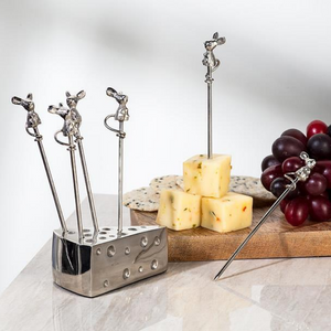 This stainless steel and brass cheese wedge holder comes with six fanciful cocktail picks, each topped with finely detailed mouse. Perfect for serving cheese, hors d’oeuvres, or garnishes, it blends playful character with elegant design. A lovely conversation starter for entertaining, and a must-have for any cheese lover’s collection.